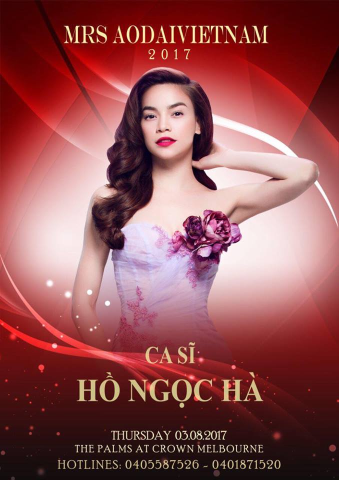 Hồ Ngọc Hà đắt show biểu diễn ở nước ngoài. Sau thành công của chương trình Love songs tại Mỹ, nữ ca sĩ sắp có chuyến đi tới xứ sở của những chú chuột túi để hát trong đêm thi Mrs Ao dai Vietnam 2017. Cùng đi với cô là nam ca sĩ Noo Phước Thịnh. Đây là hai ngôi sao được nhiều khán giả người Việt ở Australia mong đợi.