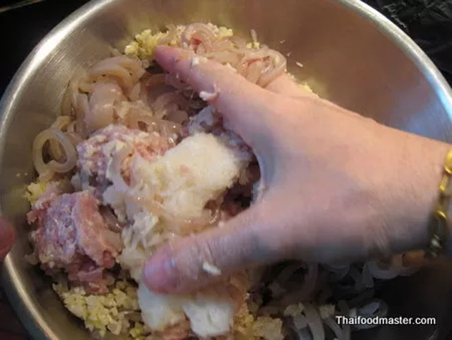 Cho tất cả các nguyên liệu thịt, bì, tỏi băm, cơm nếp, muối, đường và mì chính vào một bát to. Dùng tay trộn đều hỗn hợp thật kỹ.