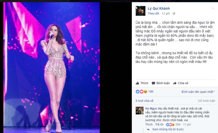 NTK Lý Quý Khánh viết: “Ủa lạ lùng nha, chọn tấm ánh sáng địa ngục từ âm phủ hất lên rồi nói chân người ta xấu. Hồ Ngọc Hà nổi tiếng mặc đồ nhảy ngắn sát người đầu tiên ở việt Nam (nghĩa là ngắn 80% phần đưới đó mấy bạn) đi hát 80% là quần ngắn, sao nói đi chợ cũng mặc đầm dài”.
