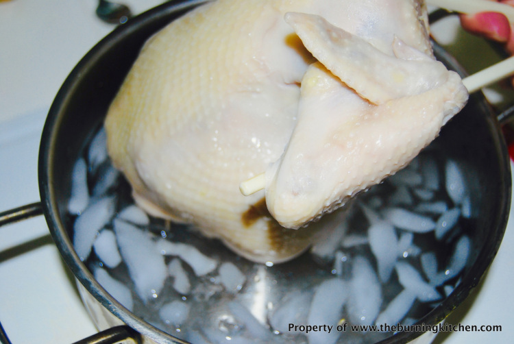 Khi thịt gà đã chín, dùng đũa nhấc gà lên từ dưới cánh và nhúng gà vào nước đá trong khoảng 20 phút để da gà giòn và thịt gà không bị nát.
