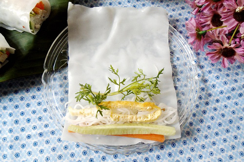 - Bước 4: Bóc từng lớp bánh phở (hoặc bánh tráng) rồi đặt thứ tự thịt bò, giò, cà rốt, dưa chuột, dứa, bún, trứng, thịt nạc, rau thơm và cuộn tròn lại. Cuộn lần lượt cho hết phần bánh phở.