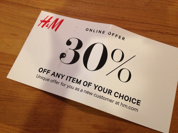 Thi thoảng, H&M sẽ ngẫu hứng gửi cho khách mua hàng online lần đầu coupon giảm giá lên đến 30% để khuyến khích khách mua thêm, và mức giảm này được áp dụng với toàn bộ mặt hàng!