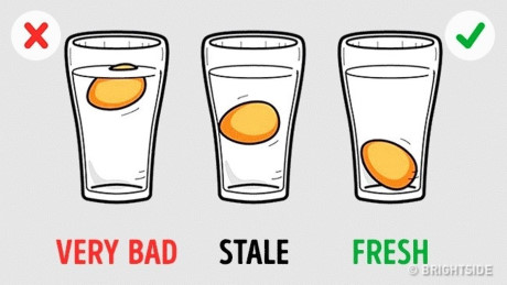 Đây là cách phân biệt trứng đơn giản nhất mà hẳn nhiều người đã biết. Bạn cho trứng vào chậu nước, nếu trứng chìm xuống hoàn toàn là trứng tươi, nếu chìm phân nửa là trứng đã cũ nhưng vẫn có thể dùng làm bánh. Trứng nổi là trứng sắp hỏng, nên bỏ đi.
