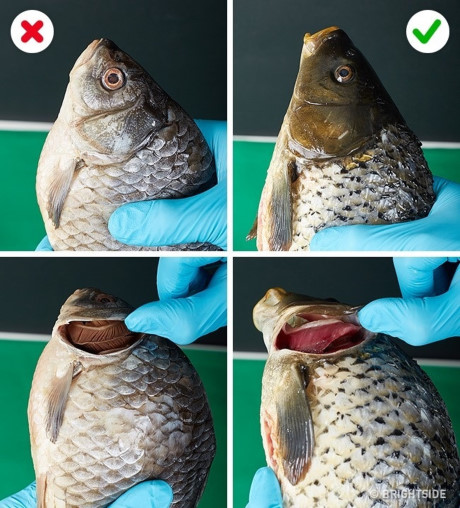Để phân biệt cá tươi, bạn hãy nhìn bề ngoài, nếu còn nhớt bóng, mắt cá còn trong suốt, vảy cá không rời ra, mang cá còn hồng, bỏ con cá vào nước thì cá chìm xuống, đó là con cá tươi. Còn nếu bề ngoài cá có dịch dính, mắt lõm xuống, vảy cá dễ rơi ra, có màu nhợt nhạt, thịt không còn đàn hồi, bụng và hậu môn trương ra, bỏ vào nước cá nổi, thì con cá đó đã bị ươn.