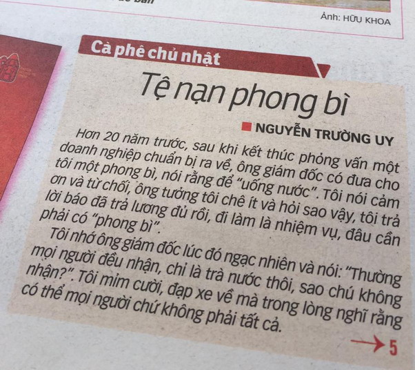 Còn bây giờ, "phong bì” là chuyện thường, thậm chí là niềm tự hào: với người đưa thì tự hào rằng mình “khéo léo”, “khôn ngoan” mua chuộc được người khác; với người nhận thì tự hào vì từ phong bì đó mà có nhiều tiền, có xe hơi, nhà lầu, con cái du học…