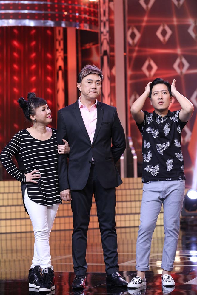 Trong tiểu phẩm, nhiều lần Trấn Thành phải khóc sướt mướt vì cuộc sống hôn nhân không êm ấm. Nam danh hài Chí Tài (giữa) vào vai người cha của Việt Hương, có con gái nổi tiếng nhưng lại không được chính con gái quan tâm.