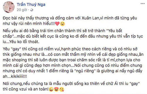 Trên trang Facebook cá nhân, danh hài Thúy Nga bất ngờ đăng tải bài báo về câu chuyện siêu mẫu Xuân Lan từng yêu "gay" kèm dòng status: "Đọc bài này thấy thương và đồng cảm với Xuân Lan, vì mình từng yêu như vậy rùi nên mình hiểu. Nếu yêu ai đó bằng trái tim chân thành thì sẽ trở thành 'Yêu bất chấp'. Mặc dù biết kết cục là cũng không đi đến đâu nhưng yêu thì vẫn tiếp tục yêu. Yêu không lối thoát".