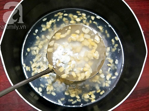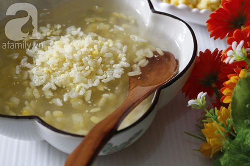 Nấu cho chè sôi, nước chè trở nên trong vắt mới cho đỗ xanh hấp chín nguyên hạt để riêng khi nãy vào, khuấy đều là tắt bếp, vậy là xong phần chè.