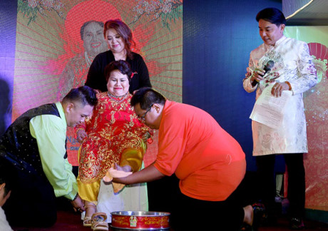Tiệc mừng thọ có cả phong tục rửa chân và chải tóc cho mẹ với những lời chúc thọ của 3 anh chị em Hồng Thủy Tiên, Hồng Phước Kiên, Hồng Quang Minh đã lấy đi bao nhiêu nước mắt của nhiều quan khách trên tàu cũng như đang xem trực tuyến trên thế giới.