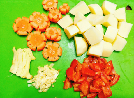 - Bước 3: Cà rốt nạo sạch vỏ rồi khứa hình bông hoa, thái miếng dày. Khoai tây nạo vỏ thái miếng to, rửa lại cho sạch. Cà chua thái hạt lựu.