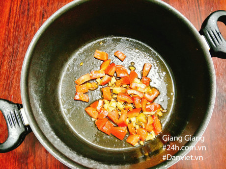 - Bước 4: Đặt nồi lên bếp cùng với 2 thìa dầu ăn, khi dầu nóng thì cho tỏi vào phi cho thơm sau đó cho cà chua vào xào tới khi cà chua chín mềm mới đổ bát thịt bò đã ướp gia vị vào xào chung.