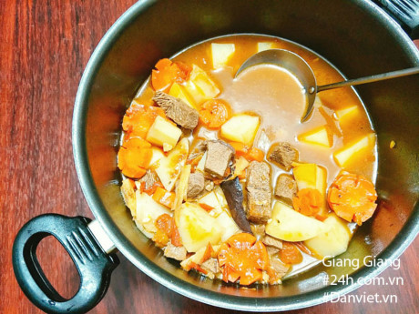 - Bước 5: Thêm nước sốt cà chua và đổ nước sôi xâm xấp mặt thịt rồi hầm cho thịt bò chín mềm, cho khoai tây, cà rốt vào hầm thêm 10-15 phút nữa, nêm lại gia vị cho vừa miệng là tắt bếp.