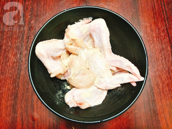 Cánh gà đem rửa sơ qua sau đó cho 1 chút giấm, muối và bóp kỹ rồi rửa lại vài lần cho thật sạch, thấm cho khô hết nước.