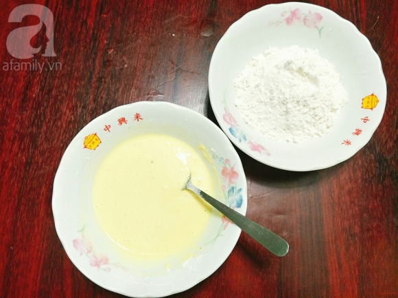 Bột chiên giòn và bột bắp đem trộn đều sau đó chia làm 2 phần bằng nhau cho ra 2 tô, 1 tô bạn cho từng chút nước vào khuấy đều sao cho bột có độ sánh đặc, khi thấy bột đã sánh đặc như ý thì dừng lại, như vậy là bạn có phần bột ướt. Phần bột khô còn lại sẽ để nguyên sử dụng sau.