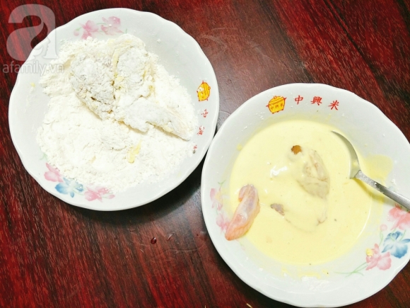 Đặt chảo dầu lên bếp đun cho dầu nóng, trong khi đó bạn gắp từng cái cánh gà thả vào bát bột ướt sao cho bột bám đều khắp cánh gà, gắp cánh gà ra cho vào bát bột khô lăn đều cho bột bám đều là được, cứ như vậy bạn làm tiếp cho hết cánh gà còn lại.