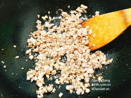 - Bước 3: Đặt chảo lên bếp cùng với 1-2 thìa dầu ăn, đun cho chảo nóng thì cho tỏi băm vào phi cho thơm sau đó cho thịt băm vào xào, đảo đều cho thịt tơi ra và có mùi thơm.