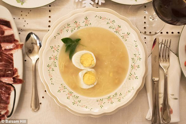 9.Tây Ba Nha: Người Tây Ba Nha ăn rất nhiều món vào dịp này như món soup mì gà ăn cùng trứng luộc, đậu gà và bạc hà, thịt xông khói, salchichon (một dạng giò chả), phô mai manchego, thịt bò bít tết ướp trong nước cam, được phục vụ với bánh phô mai xanh.