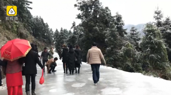 Cụ thể, do cả nhà cô dâu lẫn chú rể đều ở trên núi, nơi có đường đi rất dốc. Việc di chuyển càng trở nên khó khăn hơn khi những tuyến đường đều bị băng phủ kín, xe ôtô cũng không thể đi được. Vì vậy, đoàn đưa dâu gồm khoảng 30 người đã quyết định xuống xe để đi bộ.