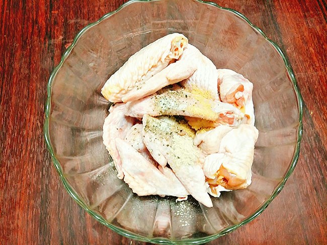 - Bước 2: Cho cánh gà vào tô rồi thêm hạt nêm, tiêu, bột canh sau đó đảo đều và ướp cánh gà 20-30 phút cho ngấm gia vị mới cho 1 thìa bột mì vào cùng cánh gà rồi đảo đều cho bột tan hết.