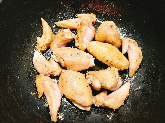 - Bước 5: Đặt chảo lên bếp cho khoảng 2-3 thìa dầu ăn đun cho dầu nóng, tiếp theo bạn gắp cánh gà cho vào chiên sơ qua. Lật cánh gà chiên cho 2 mặt cánh gà chín vàng thì vớt ra đĩa.