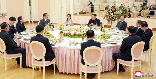 Trong bữa tiệc chào đón chuyến thăm của phái đoàn cấp cao Hàn Quốc, ông Kim Jong-un và phu nhân đã thiết đãi các món ăn địa phương của Triều Tiên như món mì lạnh, món lẩu, rượu soju Bình Nhưỡng, rượu nhân sâm, theo Reuters. Theo một quan chức giấu tên thuộc phái đoàn Hàn Quốc, phía Triều Tiên dường như đã ghi chép lại cẩn thận về những món ăn của Bình Nhưỡng mà các quan chức Seoul đã nhắc tới trong chuyến thăm của em gái ông Kim, bà Kim Yo-jong tới Hàn Quốc tháng trước.