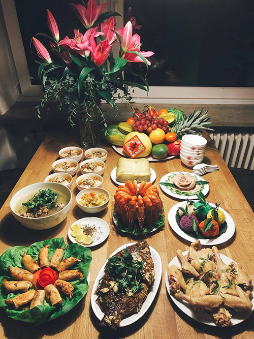 "Gia đình mình đón Tết khá đơn giản! Mình trang hoàng vài cành mai, một ít hoa quả, bánh trái và mứt. Mình nói với các con rằng hôm nay là ngày Tết Việt Nam, chúng rất vui và còn khoe với cô giáo", chị Nga kể. "Đêm giao thừa, mình chuẩn bị một ít món ăn để cả nhà quây quần bên nhau. Đón Tết ở đất khách dù buồn nhưng mình vẫn cảm thấy hạnh phúc khi các con biết đến Tết và không bao giờ quên cội nguồn của chúng".