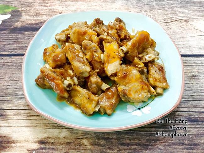 Sườn 5 lạng chặt thành những miếng vừa ăn, rửa sạch, để ráo. Sườn ninh qua 10 phút cho đỡ dai rồi chiên sém vàng. Pha 2 thìa ăn phở nước mắm, 1 chút bột canh, 2 thìa tương ớt, 1 thìa tương cà chua, 1 thìa đường, tỏi băm nhỏ, 1 thìa dầu hào, chút nước lọc, 1 thìa nhỏ hạt tiêu. Khuấy thật đều cho tan, cho hỗn hợp vào ướp sườn 15 phút.
