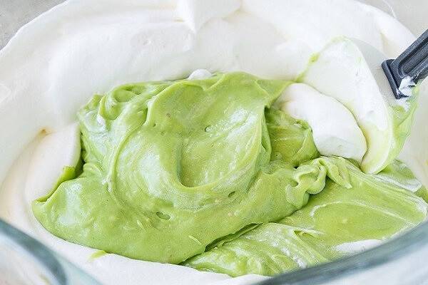 – Trộn nhẹ nhàng bơ, kem cốt dừa và ít mật ong với nhau bằng kĩ thuật fold (hất thìa từ dưới đáy âu lên).