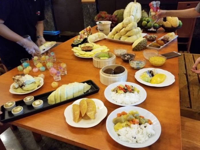 Một số món ăn chế biến từ sầu riêng đang được sắp đặt trước khi tiệc buffet sầu riêng bắt đầu (H́nh: Ngọc Lan/Người Việt)