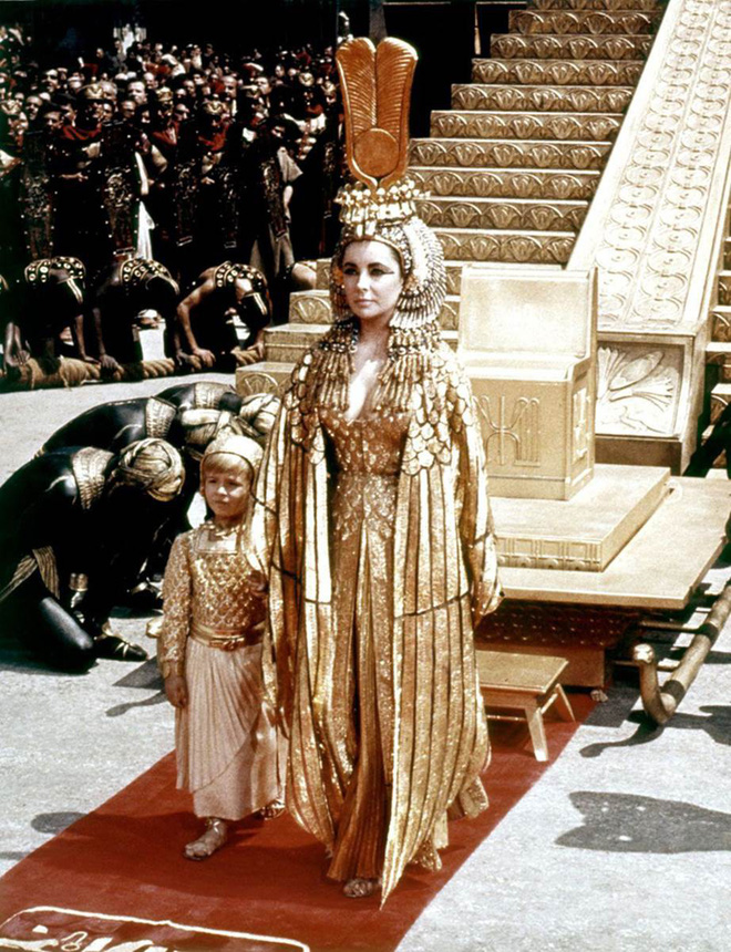 Elizabeth Taylor đã hóa thành bà hoàng đúng nghĩa trong phim "Cleopatra" với bộ trang phục vàng ánh kim đồ sộ và tinh xảo.