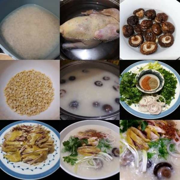 - Bước 4: Sau khi vớt gà cho gạo và đậu xanh vào ninh nhừ, thỉnh thoảng khuấy đều để cháo không bị bén đáy nồi. Đun 30 – 45 phút cháo chín nhừ thì cho tiếp 1 thìa canh nước mắm và 2 thìa cà phê mì chính ( nếu không ăn mì chính có thể bỏ qua), cho nấm hương vào và nấu thêm 15 phút nữa là được.