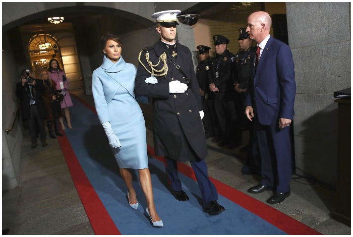Bà Melania tới Nhà thờ Thánh John trước lễ tuyên thệ nhậm chức của chồng, ông Donald Trump khi ông chuẩn bị tuyên thệ trở thành Tổng thống thứ 45 Hoa Kỳ. Bà Melania Trump đã lựa chọn trang phục kiểu váy áo cao cổ màu xanh da trời nhạt, kiểu dáng bespeak, kết hợp găng tay da lộn và giày cao gót cùng gam của thương hiệu thời trang bảo vệ những giá trị cổ điển của người Mỹ Ralph Lauren. Trang phục cho thấy ngụ ý ngầm với vị thế mới, tân Đệ nhất Phu nhân có trách nhiệm phụng sự cũng như đại diện cho quốc gia hiện diện trước thế giới.