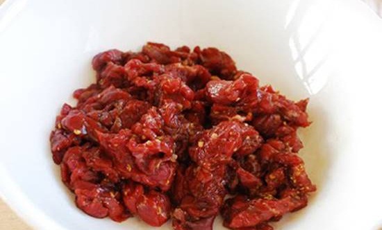 - Bước 1: Thái thịt bò thành miếng vừa ăn. Bạn thái miếng mỏng để thịt nhanh ngấm gia vị.