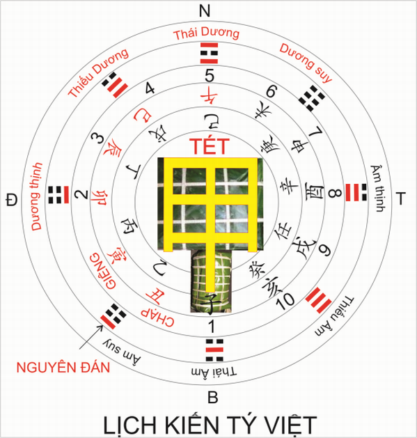 Quan điểm của người Việt, tức là dân tộc đã làm ra lịch Kiến Tý, mọi việc bắt đầu từ Tý hay chỗ phân chia Âm Dương, PM và AM, vì vậy Can bắt đầu với Giáp, Chi bắt đầu với Tý, Số bắt đầu là 1, như vậy mới thống nhất hệ thống dịch học, cho nên lịch Kiến Dần không có số bắt đầu, tức số 1, là một khiếm khuyết của nhà Hán, vì Chánh Nguyệt không thể là tháng 1 được. Dĩ nhiên Tết cũng theo nguyên tắt trên, có nghĩa là phải nó phải là Tết hay Tiết đầu tiên, tức là Tết Nguyên Đán, bắt đầu từ tháng Dần, quái Cấn. Có nghĩa là ngày xưa dân ta cũng ăn Tết như hiện nay. Nói như thế thấy khó hiểu quá, vì cuối năm là tháng Tý, sao lại ăn Tết tháng Dần. Người đọc cần để ý, ngày xưa người ta tính một canh giờ bằng 2 giờ hiện nay, tức giờ Tý là từ 23 giờ tới 1 giờ sáng, có nghĩa là bắt đầu sau 1 giờ sáng mới tới giờ Sửu, lúc đó mới sang ngày mới, nhưng người ta chọn điểm giữa để định vị – Tý. Đó là giờ, ở đây là Tết, ta biết Tết (Tiết) cuối cùng bắt đầu từ Lập đông, đầu tháng 10 – Hợi, theo Ruộng lịch, cho đến Đại hàn cuối tháng Chạp hay 12 – Sửu, như vậy đầu tháng Giêng – Dần mới bắt đầu Tết mới. Đây là lý do vì sao nói tuế chung là tháng Tý mà năm mới lại tháng Dần. Trong dịch học người ta chia vũ trụ thành hai, một là theo hai trục Tung Hoành, tức Tý Ngọ, đây là cách chia âm dương theo thời gian thuộc Can Chi, hai là chia theo trục Đông Bắc – Tây Nam, đây là cách chia âm dương theo tứ tượng – bát quái, cả hai đều chia vũ trụ làm hai hay Tét vũ trụ làm hai. Do đó từ TẾT mang đủ cả hai khái niệm này. (Xem hình minh họa).