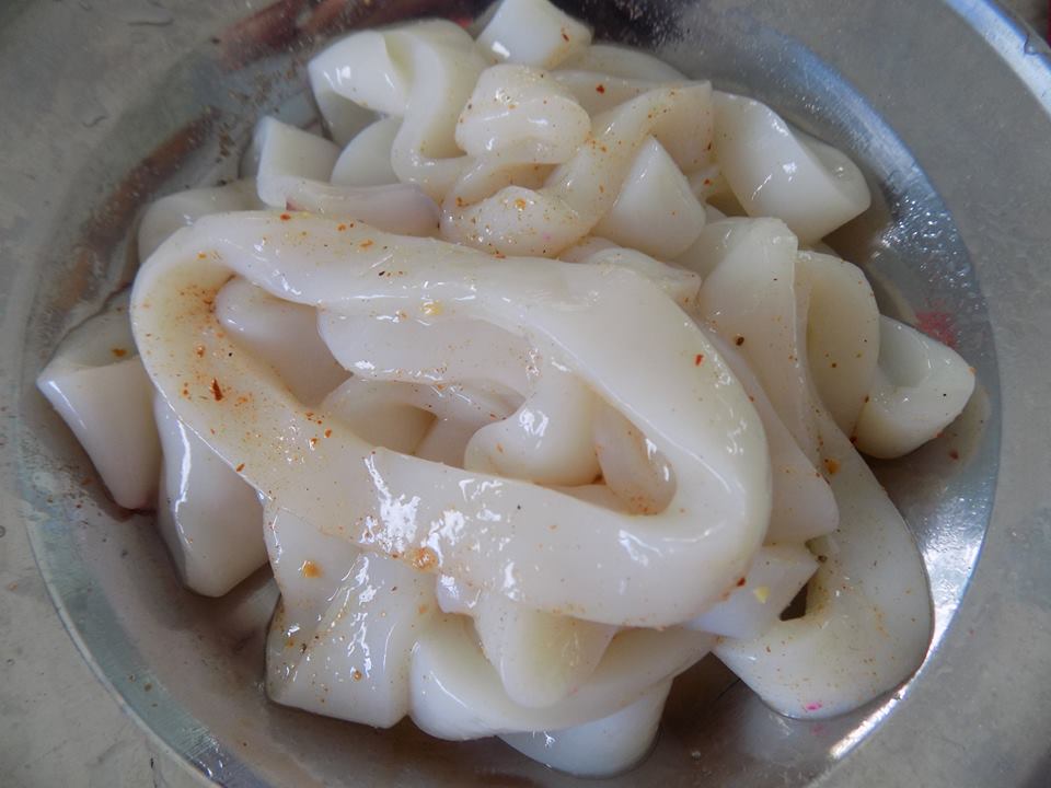 Mực tươi mua về sơ chế thật sạch, bỏ hết phần ruột bên trong, rửa sạch, thấm khô , cắt thành miếng tròn kích cỡ 4-5 mm, rồi ướp với chút muối tiêu.