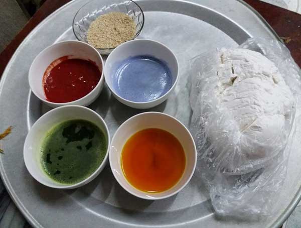 Chia bột thành 5 phần đều nhau: mỗi hỗn hợp bột gồm 100g bột, 25g đường. Trộn đều từng tô bột cùng các hỗn hợp bí đỏ, gấc, lá dứa, củ dền. Sau đó chế từ từ nước ấm vào và nhào đến khi bột dẻo dai vừa phải. Để ủ 30p.