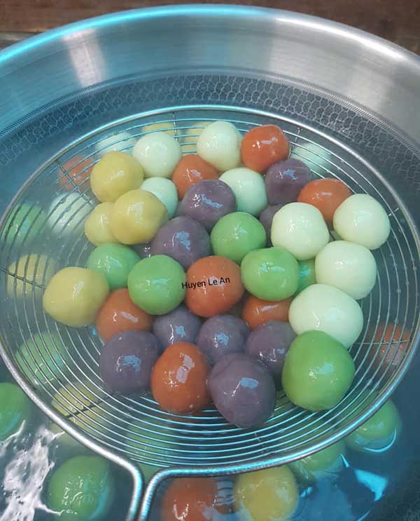 Chuẩn bị 2 nồi nước. 1 nồi nước sôi và 1 nồi nước lạnh (dùng nước lọc hoặc nc đun sôi để nguội, thả vài viên đá vào cho nước mát). Thả từng màu vào luộc đến khi bánh nổi lên mặt nước, lập lờ tầm 30s-1' là bánh chín. Các bạn vớt bánh ra, thả vào nồi nước lạnh. Sau đó vớt bánh ra đĩa. Làm lầm lượt cho đến hết.