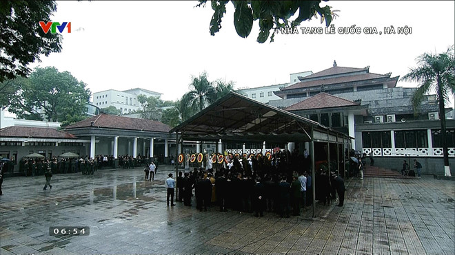 Ngay từ sáng sớm, trời Hà Nội đă đổ mưa. Các tuyến đường xung quanh Nhà tang lễ quốc gia (số 5 Trần Thánh Tông) - nơi quàn linh cữu của cố Chủ tịch nước đều cấm phương tiện qua lại, các hoạt động an ninh được thắt chặt trước giờ diễn ra lễ Quốc tang.