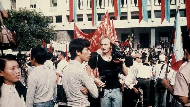 Stephan Köster, người cộng sản Tây Đức, với máy quay phim trước Dinh Độc lập