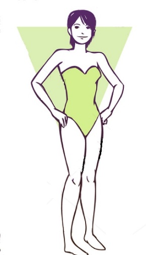 Với cô nàng tam giác ngược, nếu không sở hữu một bộ ngực nở nang, không nên mặc các loại áo độn quá dày, các kiểu áo cổ chữ V như yếm, halter neck, cross neck hay lệch vai. Bạn cũng nên tránh các loại áo có dây to bản và kiểu áo bơi dạng ống băng ngang ngực. Bạn nên lựa chọn bikini cùng các mẫu có họa tiết và kiểu dáng đơn giản và nên chú ý đến dây áo bơi, chọn kiểu có dây mảnh.