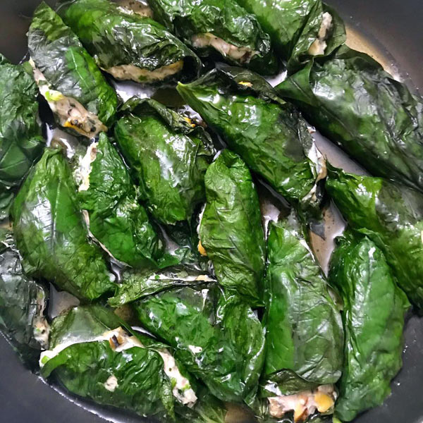 Cách thứ nhất như mình dùng lá lốt bọc chả lại, để lá lốt to lên lòng bàn tay nhớ đi bao tay vào nhé, dùng thìa nhỏ múc lượng vừa phần chả vào giữa lá lốt rồi nhẹ nhàng gấp lai, cứ làm lần lượt cho đến hết (các bạn xem hình nhé)