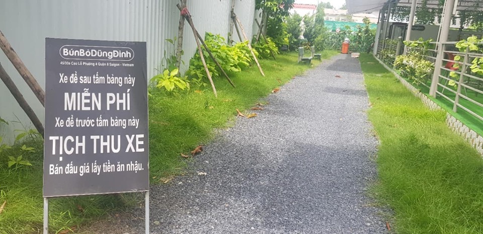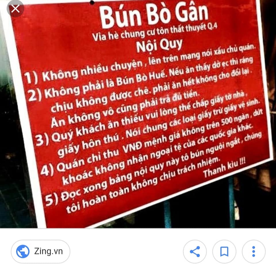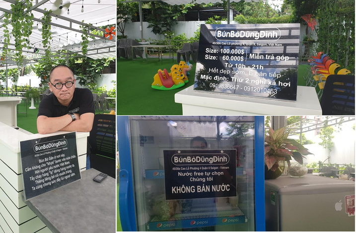 Cách đây vài năm, cư dân mạng xã hội chia sẻ hàng loạt hình ảnh nội quy hài hước của quán bún bò gân Dũng Đinh (ca sĩ Đinh Dũng), sau đó họ “dậy sóng” khi biết các bảng này bị cán bộ tịch thu.