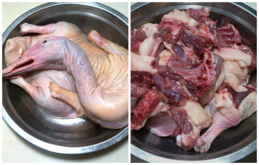 Bước 1: Đầu tiên bạn rửa thịt vịt thật sạch rồi chặt thành miếng vuông hoặc hình chữ nhật cho vừa miệng