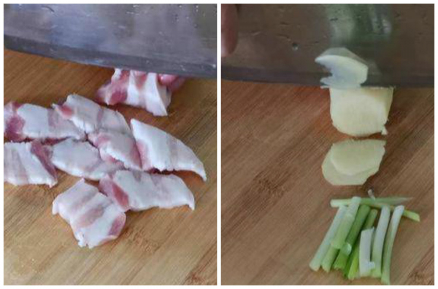 - Hành lá cắt khúc, gừng, tỏi thái lát. Thịt lợn thái miếng vừa ăn.