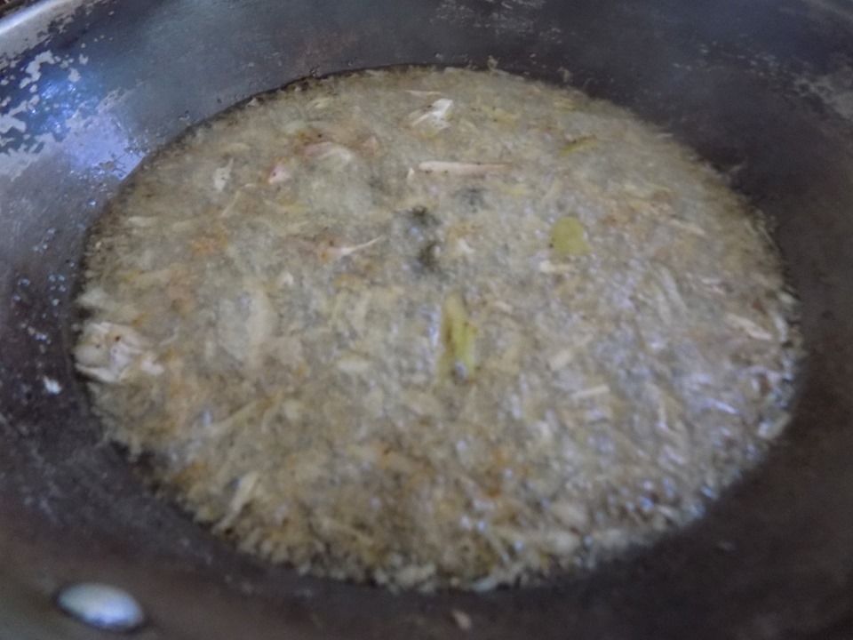 Bước 3: Bắc chảo dầu lên bếp ( không cần quá nhiều dầu). Khi dầu nóng cho hành + tỏi và tiêu giã nát vào chiên với lửa vừa. Khi thấy nguyên liệu này vàng thơm và giòn thì vớt ra dĩa có lót giấy thấm dầu.