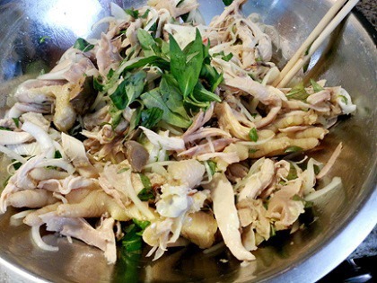 Gà đã chín thì vớt ra, để nguội và xé thành từng sợi nhỏ, với hành lá, ớt, vừng rang, nước tương. Bóp đều tay để gà ngấm đều sẽ ngon hơn.