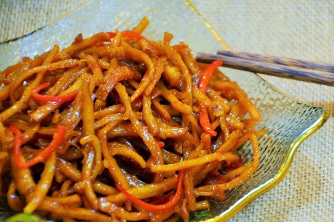 - Cho mực đã xé sợi vào đảo đều cho thấm đều gia vị. Nêm nếm lại gia vị cho vừa miệng. Đảo đều ít phút, khi thấy sốt cạn thì tắt bếp, rắc vừng đã rang chín vào trộn đều.