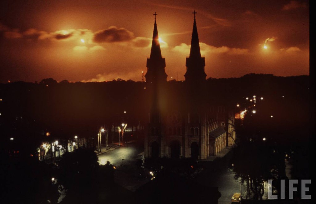 Nhà thờ Đức Bà buổi đêm, 1968. Nền trời rực sáng ánh lửa của hỏa châu (pháo sáng quân sự). Ảnh: Life.
