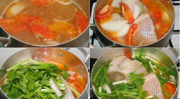 Sau đó, thả dứa vào nước canh. Khi sôi lại, trút cá vào nấu đến lúc cá chín hoàn toàn rồi vớt cá ra để riêng.