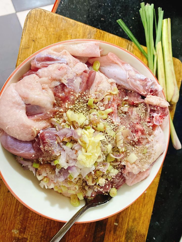 Ướp vịt với 1/3 thìa gia vị, ½ thìa hạt nêm, ½ thìa hạt tiêu và ½ số hành tỏi sả vừa bằm nhỏ, ướp trong 30 phút.